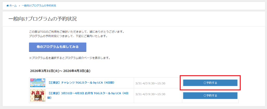 お弁当を注文の際は下記手順でシーズンスクールプログラムとお弁当を同時に予約することができます。
