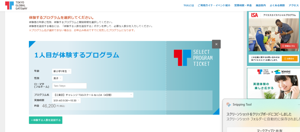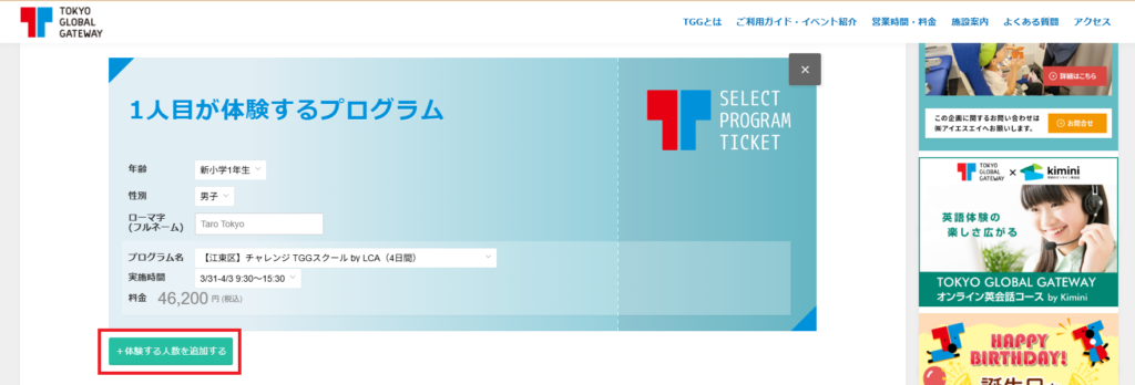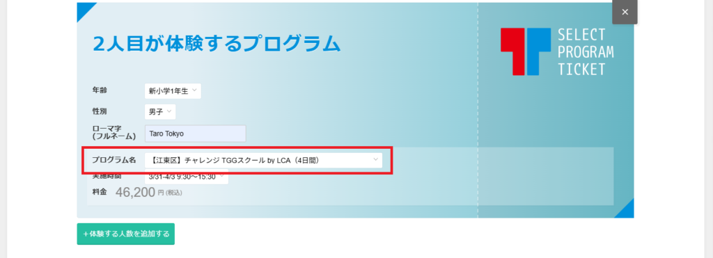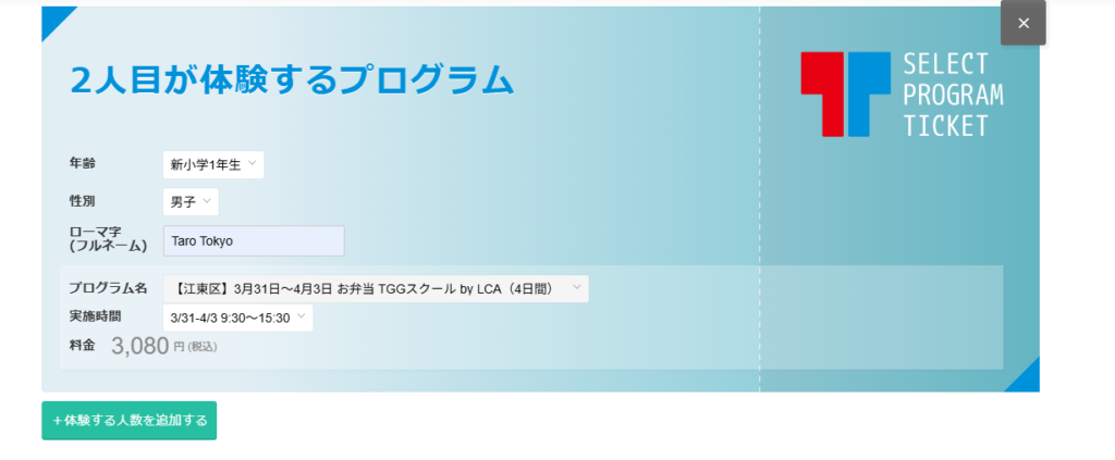 ③左下の緑の四角”体験する人数を追加する”を選択