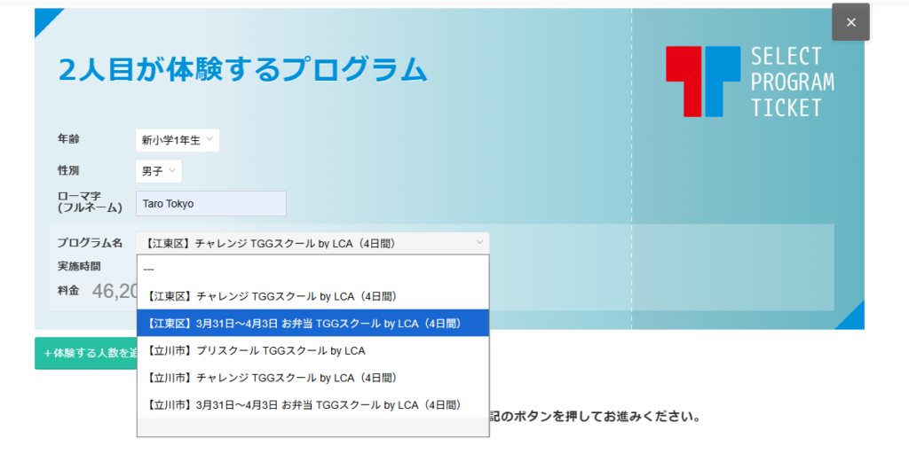 ③2人目が体験するプログラムが出現します。1人目が体験するプログラムと同じ情報(年齢・性別・ローマ字)を入力する。